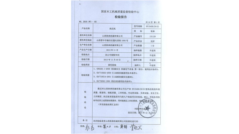 BY21型熱壓機、BY624×8/16、BY154×8/20(5)通過國家木工機械質(zhì)量監(jiān)督檢驗中心檢驗